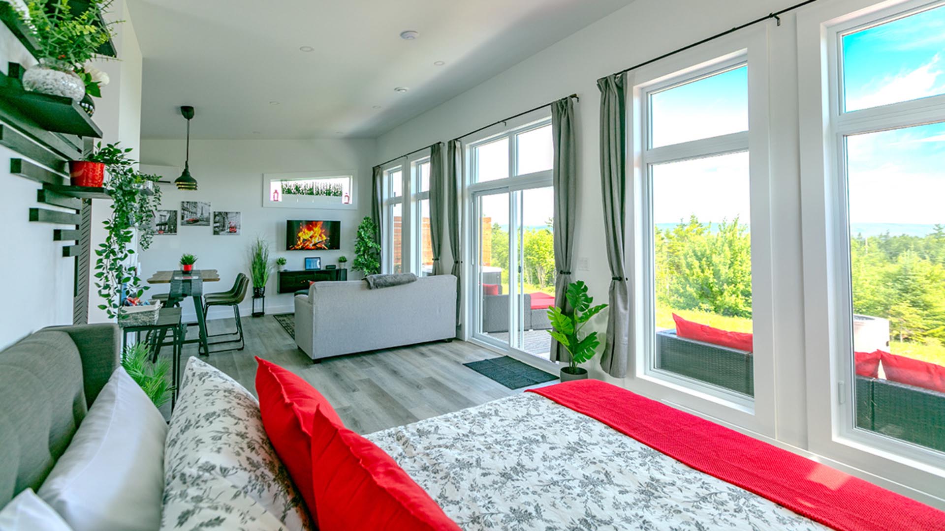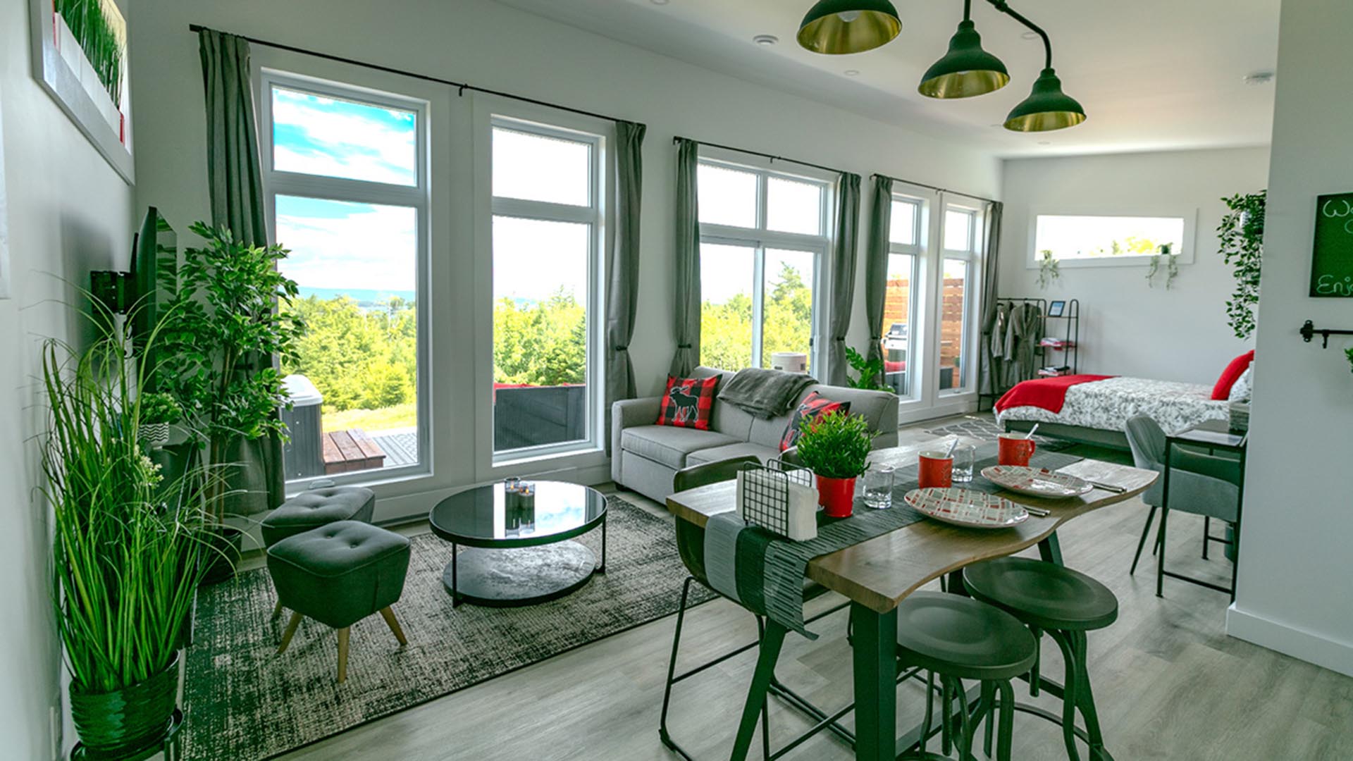 Piper’s Creek Cottages offer three, 540 square foot studio style cottages, each with a fully equipped kitchen, queen-size bed in the bedroom, living room with a full/double sleeper sofa, dining area, bathroom and a large patio with a private hot tub, BBQ and fire pit. Guest will enjoy an incredible view overlooking the gorgeous Bras d’Or Lake and the mountains in the distance from the floor to ceiling windows.  This is the perfect spot to simply relax for a perfect getaway yet have all the opportunities to adventure close by with everything you need to feel like home.
