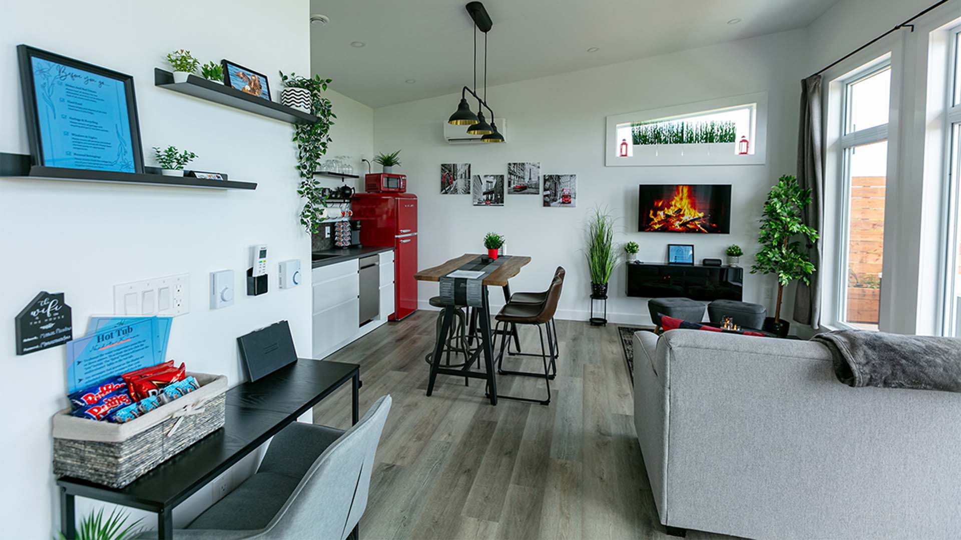 Your open concept living and dining area features a bar-style dining table where you can enjoy your meal while taking in the gorgeous views. In the living area, sit back and relax while watching your favourite show or movie on the smart tv which offers all popular streaming services. Or, if you prefer, books and boardgames are also provided for your entertainment.
