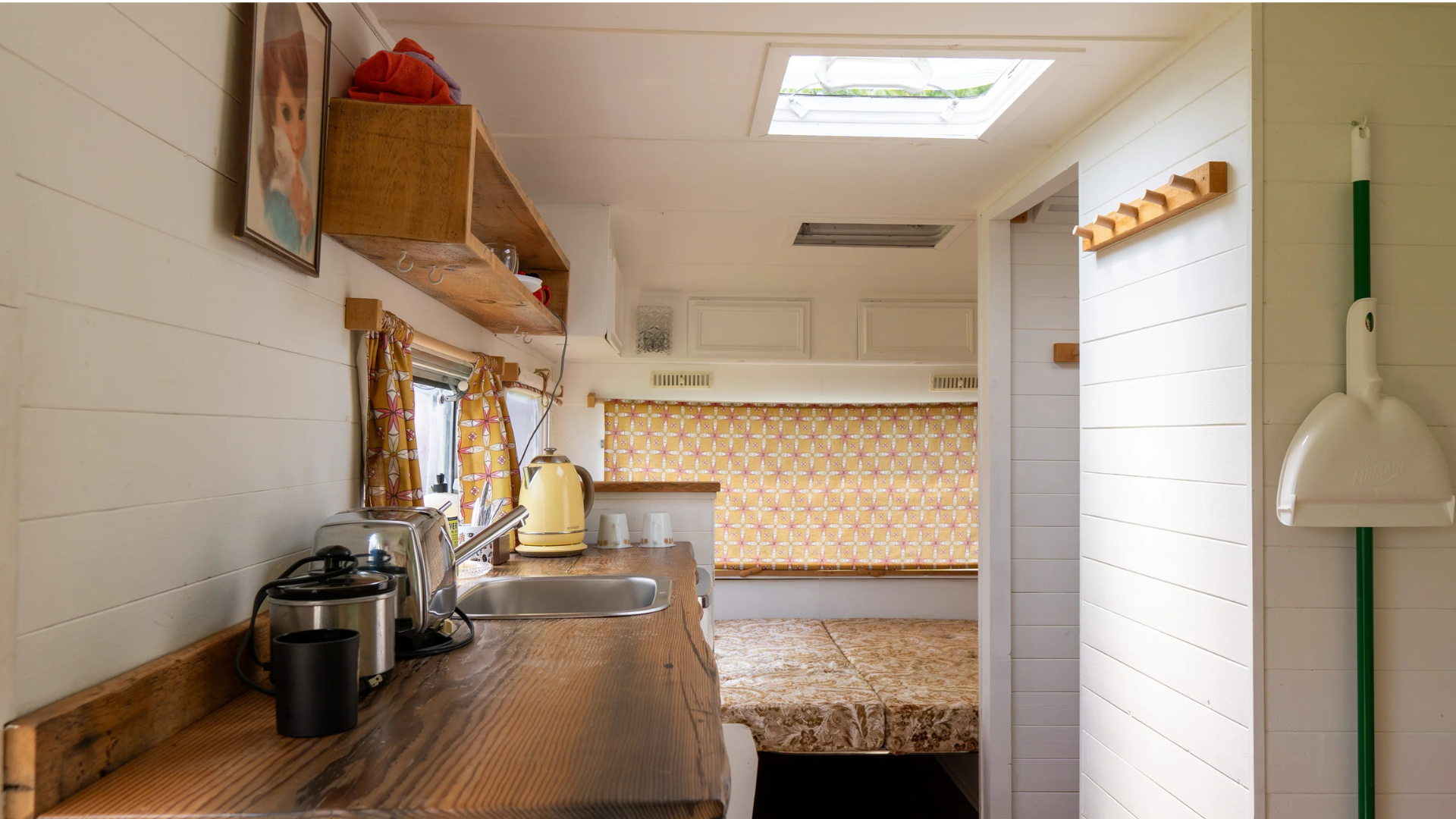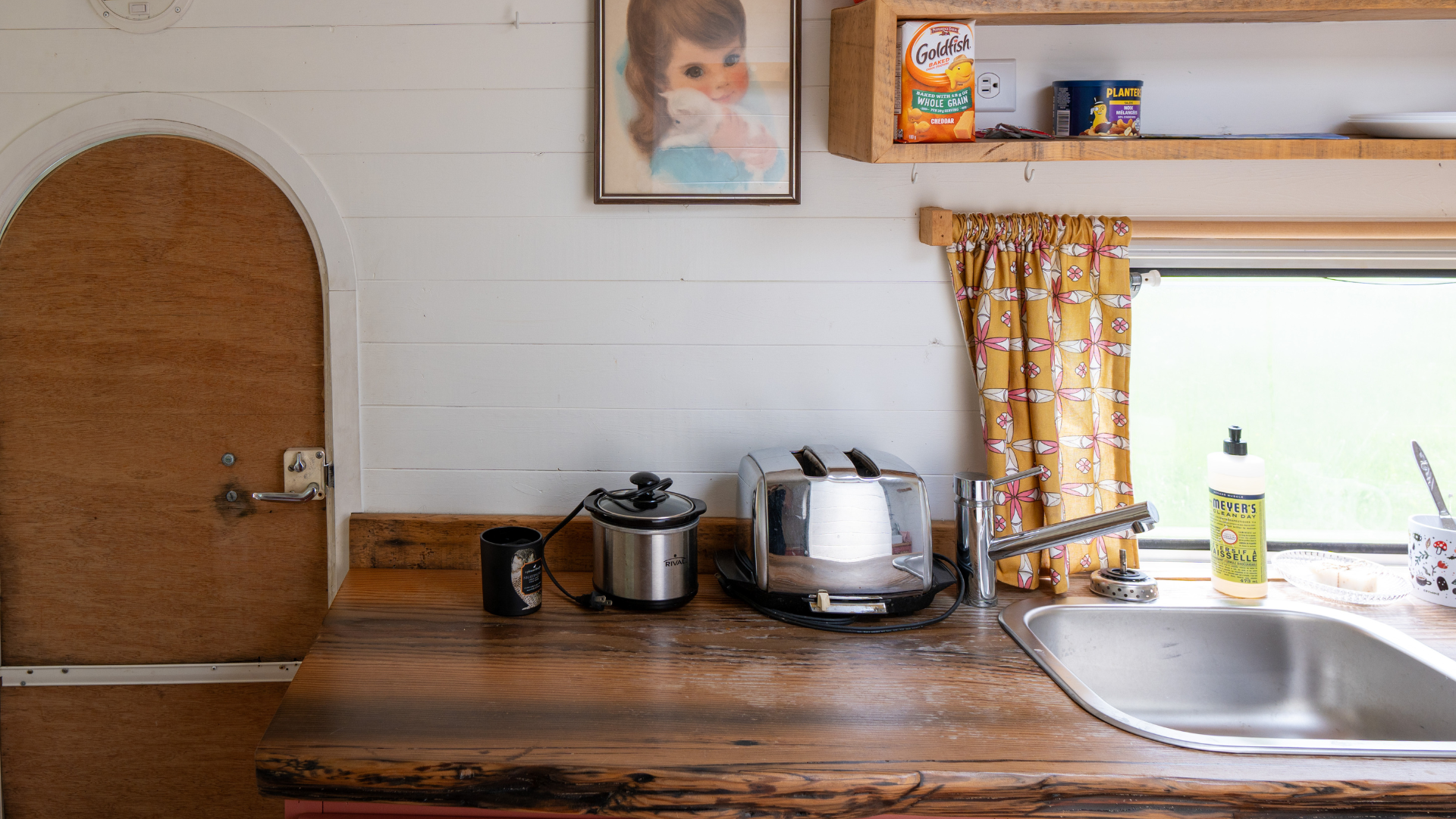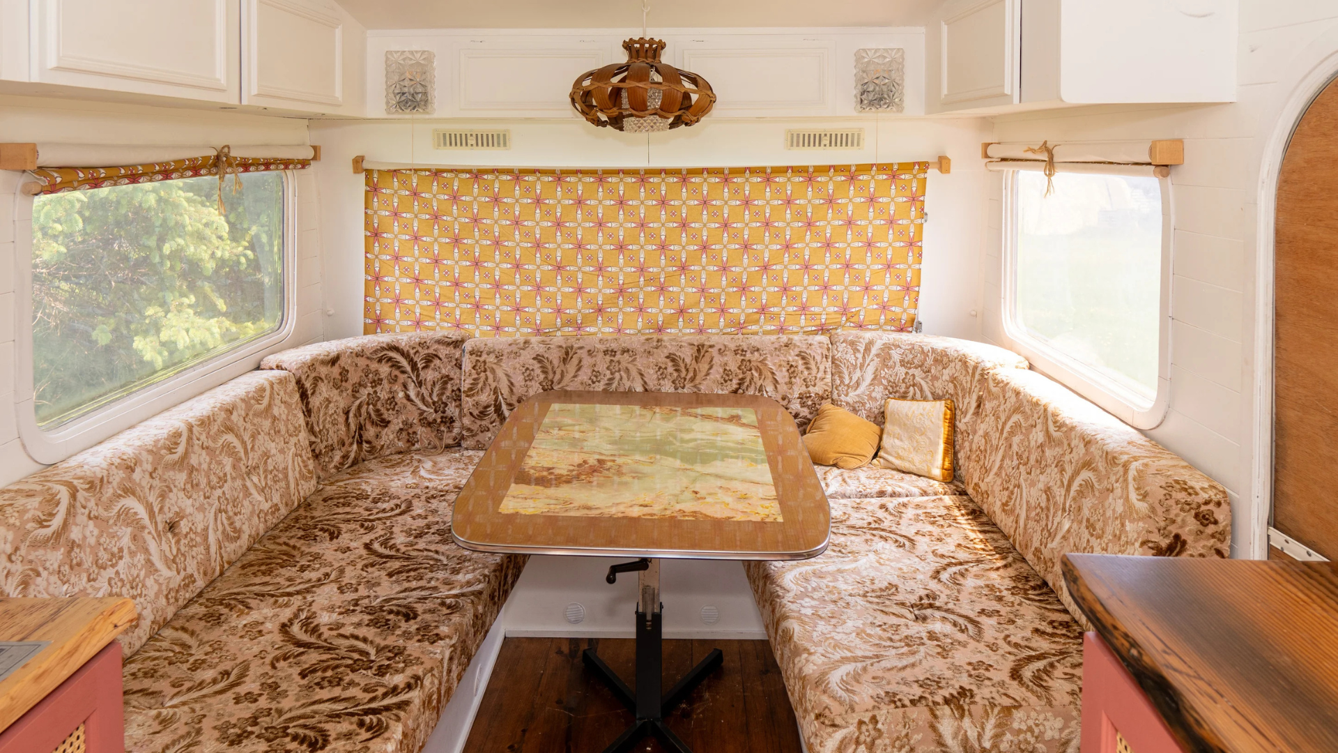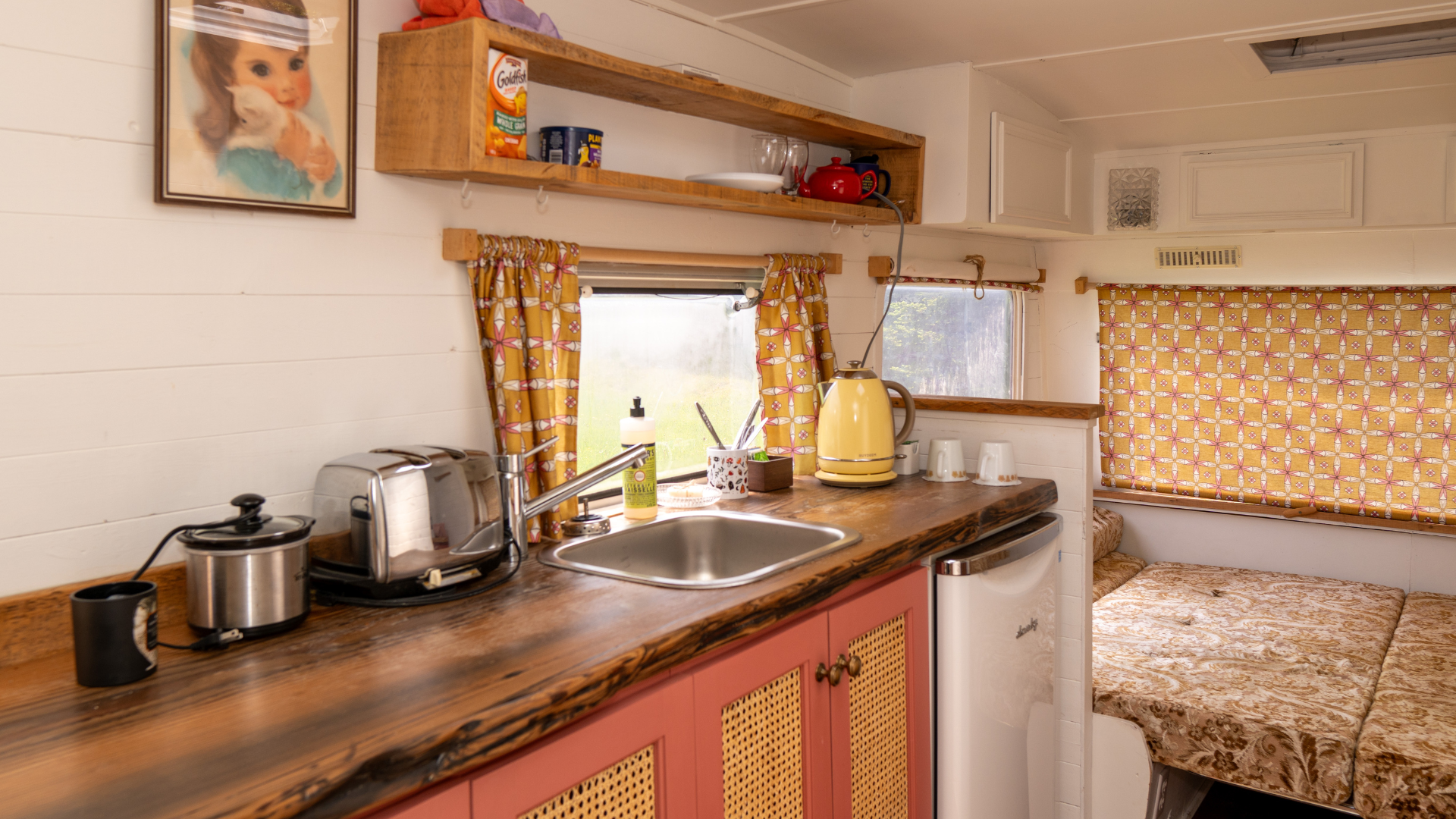 1974 camper located behind Rosefinch Mercantile and Tea Room—a thriving café and curios shop. The camper is all one space, with two seating areas that can be set up as seating areas, a half bathroom (no shower) and kitchenette (kettle, microwave and small fridge). Guests are welcome to spend time in the cafe during opening hours, from 10am to 5pm (or later, if we are having an evening event). Guests are also encouraged to spend time in the community garden.