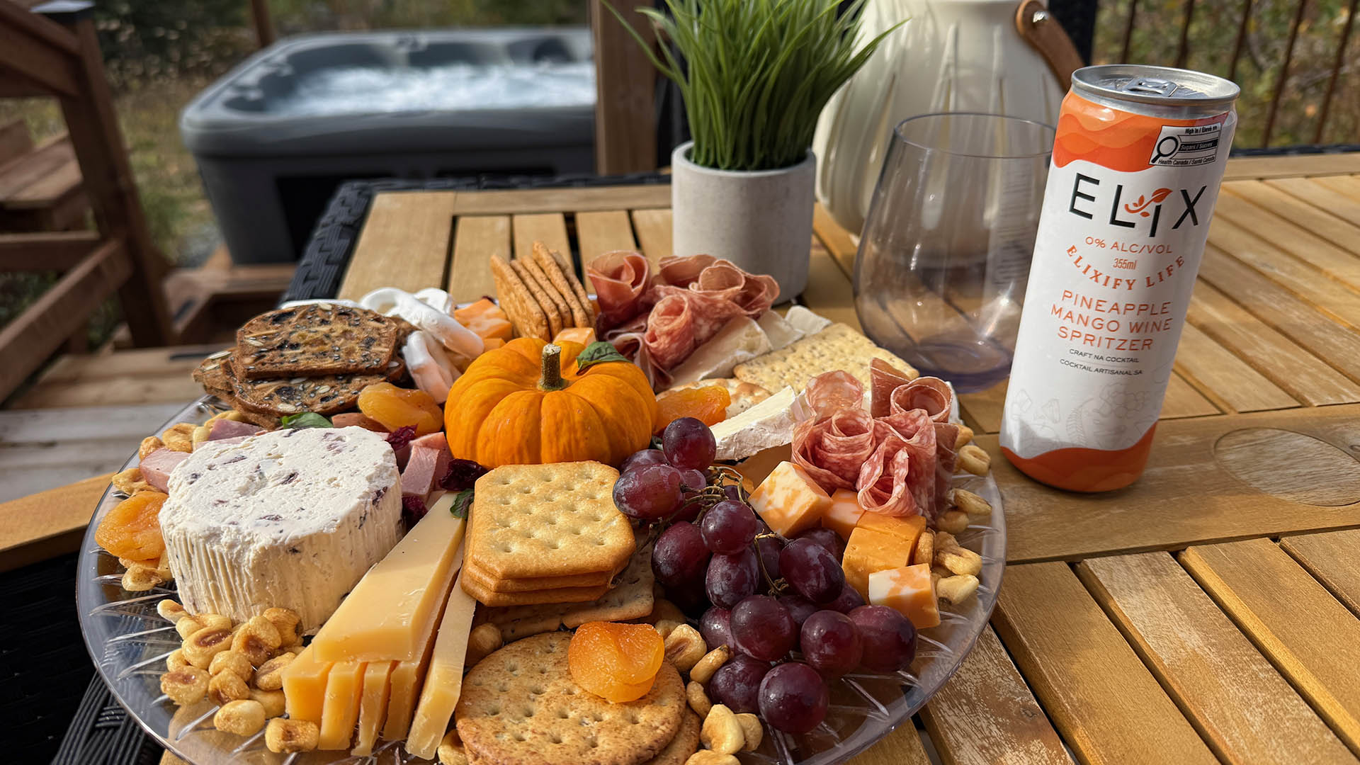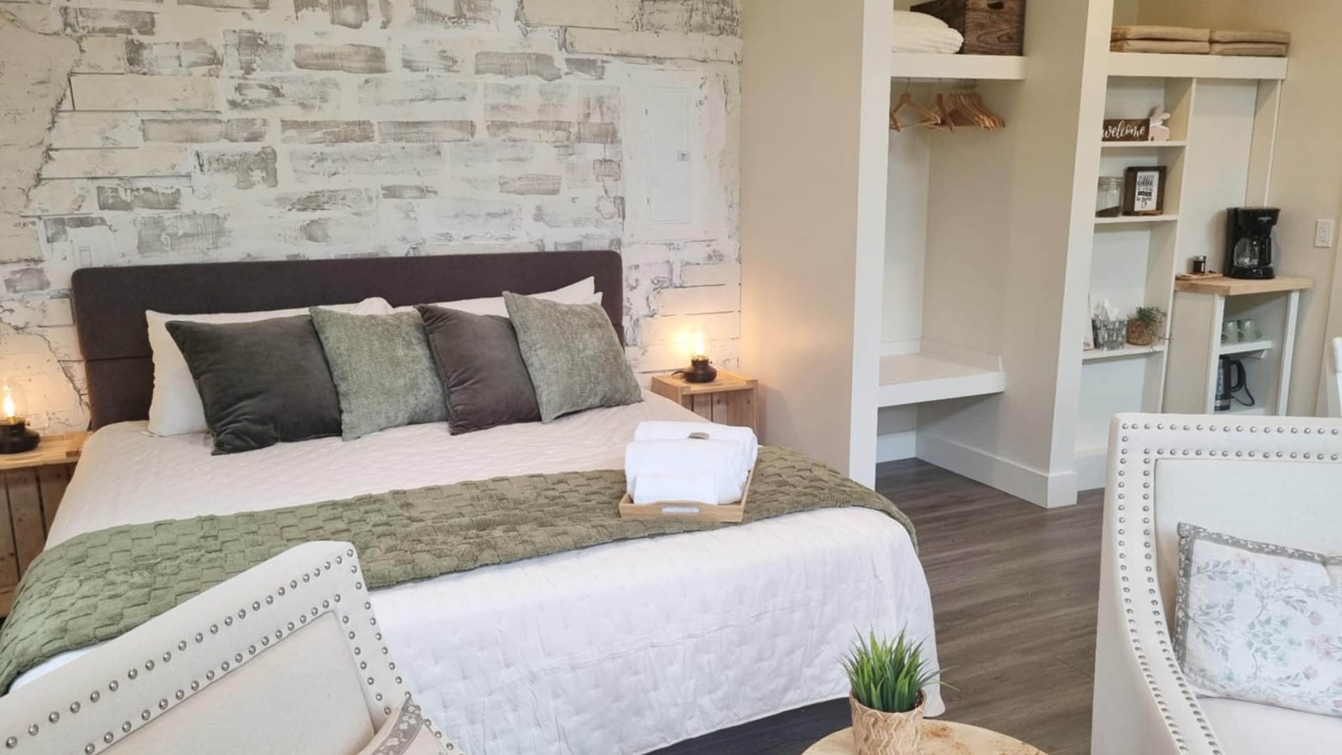 Cabin 3 – Sleeps 2- Escape to the cozy elegance of The Salt Spring at Watervale Springs Retreat. Your private deck is equipped with a gas BBQ, gas firepit and outdoor dining. This bright, space features a beautifully designed space with king sized bed, neutral tones, and a chic, textured accent wall that brings a modern rustic feel. A kitchenette offers convenience, and large windows provide beautiful views of nature. Designed as an adults-only retreat, you can unwind and connect with the peaceful outdoors.