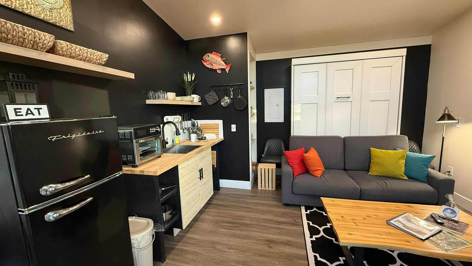 Cabin 2- Sleeps 4- The West River- Experience comfort and style in this beautifully designed black and white cabin, perfect for your relaxing getaway. This elegant space features a separate bedroom with a plush king bed for restful nights, a cozy kitchenette for light cooking, and a queen-sized Murphy bed in the living area for additional guests. Ideal for up to 4 adult guests, it’s the perfect spot for couples or friends seeking relaxation.