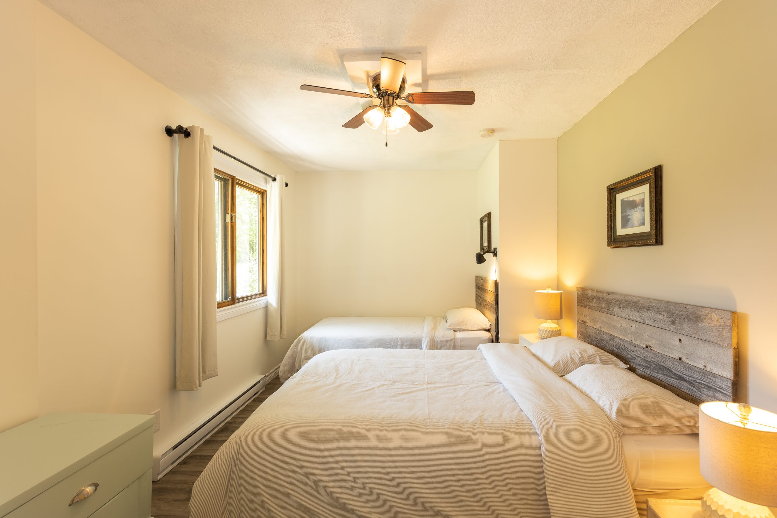 Our accommodations include 2 two-bedroom cottage and 1 duplex cabin with two double beds or one queen-size bed, 3-piece bath, satellite TV, and free wifi. Our lodge features a licensed dining room (open year-round) and lounge.