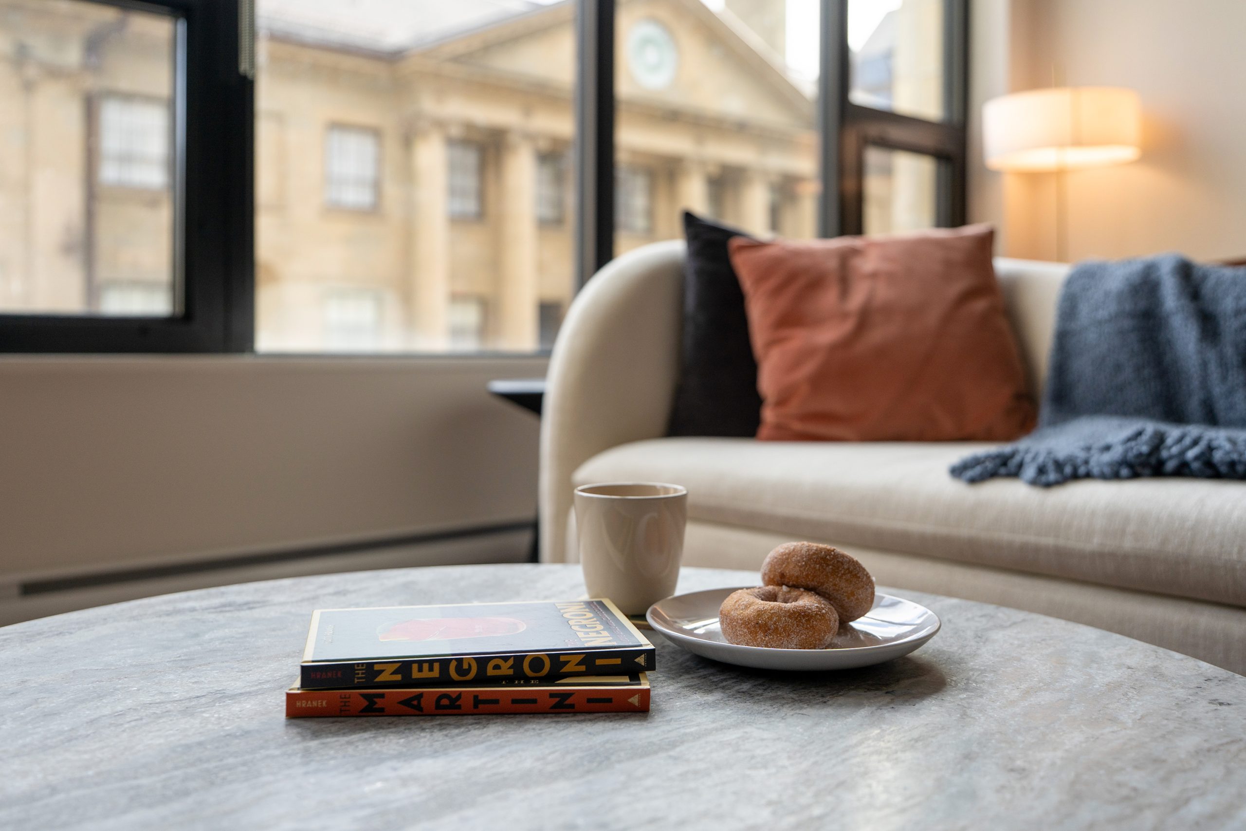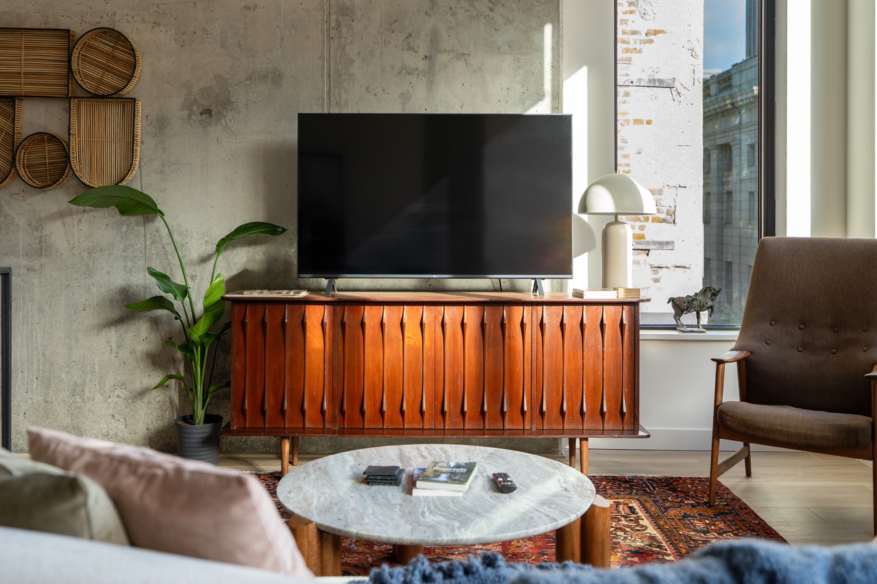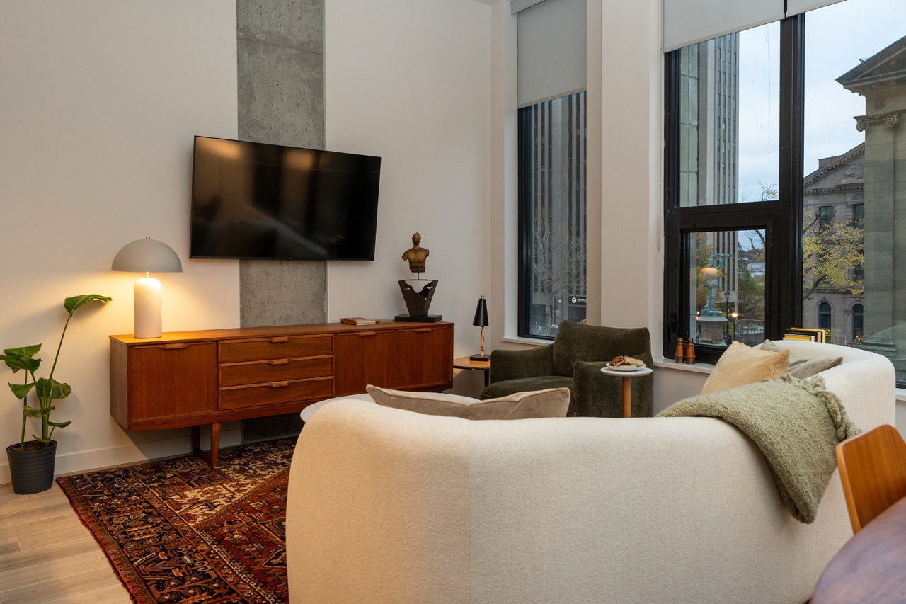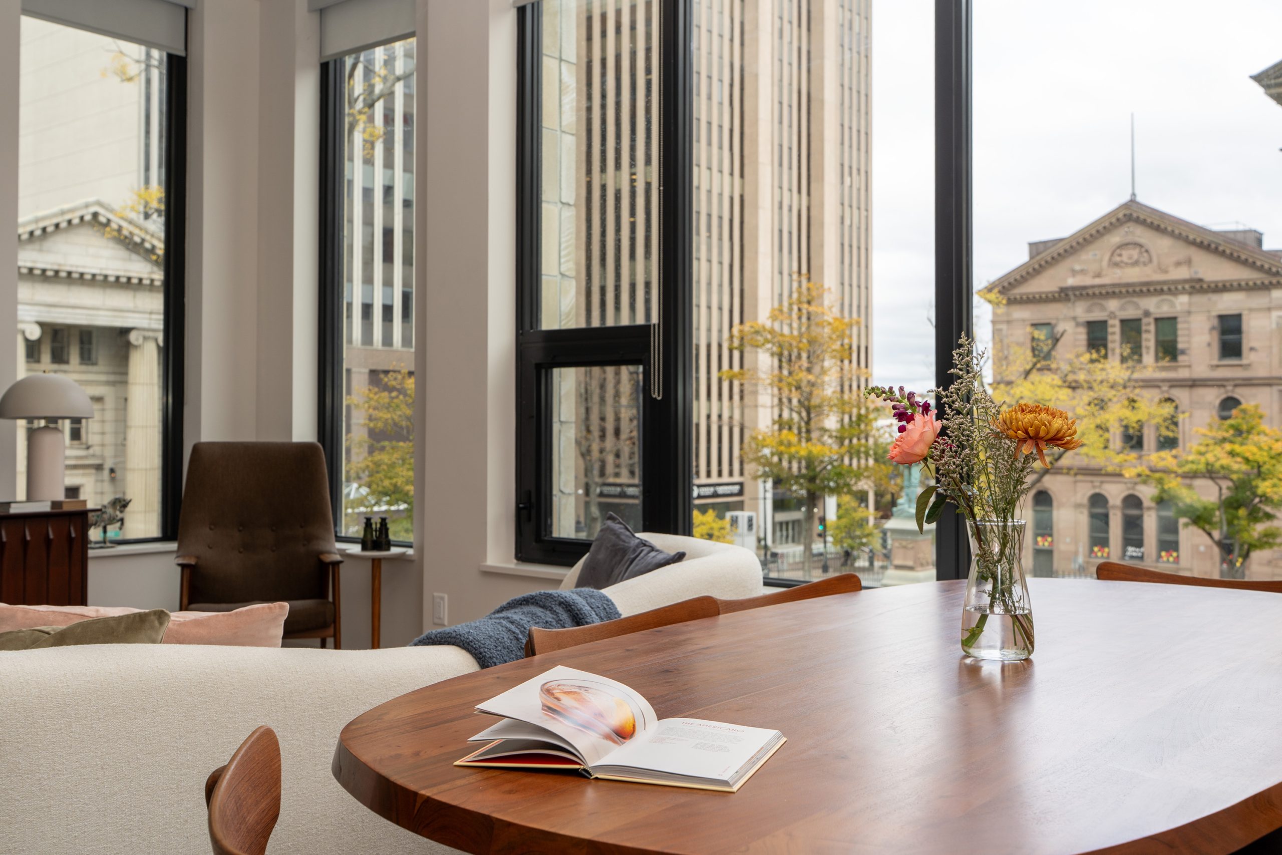 Granville: 1730 Granville Street places you at the centre of downtown Halifax, one block from the waterfront and surrounded by the streets that define the city. Halifax City Hall and Province House are just steps away, with the harbour boardwalk a short walk down the street. The building occupies the historic Kenny-Dennis Building — one of Halifax’s oldest commercial addresses, originally built in 1863 as part of the Press Block. That history is still present in the streetscape, now layered with restaurants, cafés, and everyday destinations, including The Highwayman and morning coffee at Weird Harbour. Inside, furnished one- and two-bedroom apartments offer full kitchens, in-suite laundry, and secure underground parking. Interiors combine mid-century modern furniture with Persian textile accents — creating spaces that feel grounded and composed within a more energetic urban setting. Whether you’re here for a few nights or a longer stay, Granville offers direct access to the city — with a space that lets you step back from it when you need to.
