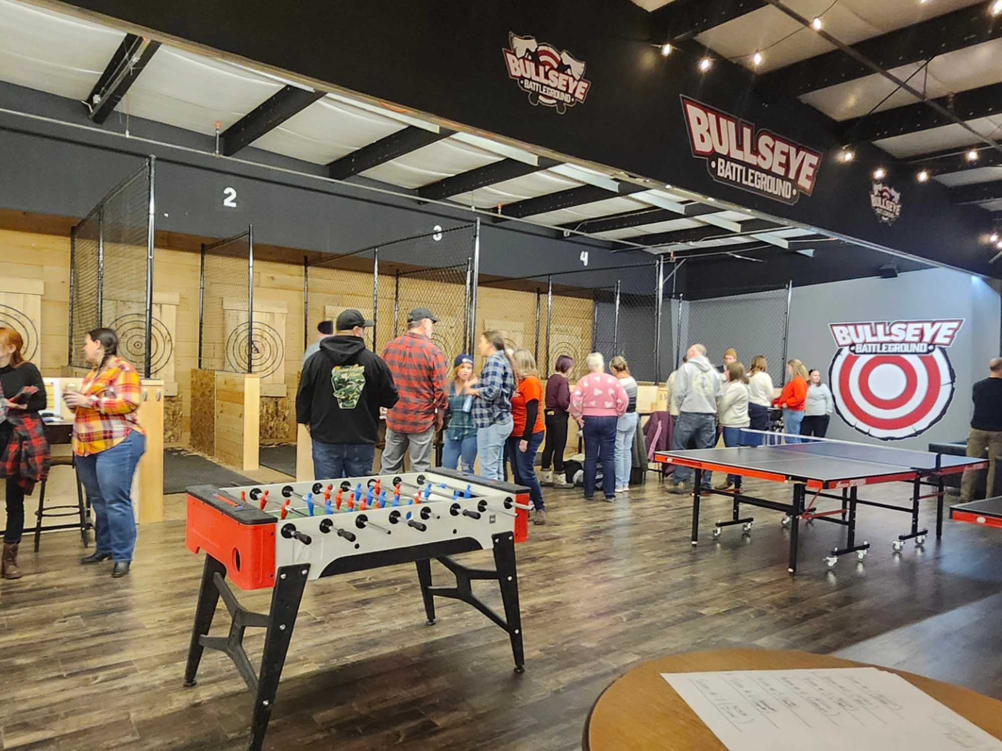 • Bullseye Battleground, offering axe throwing, pool tables, dart boards, ping pong, shuffleboard, and a full games room;