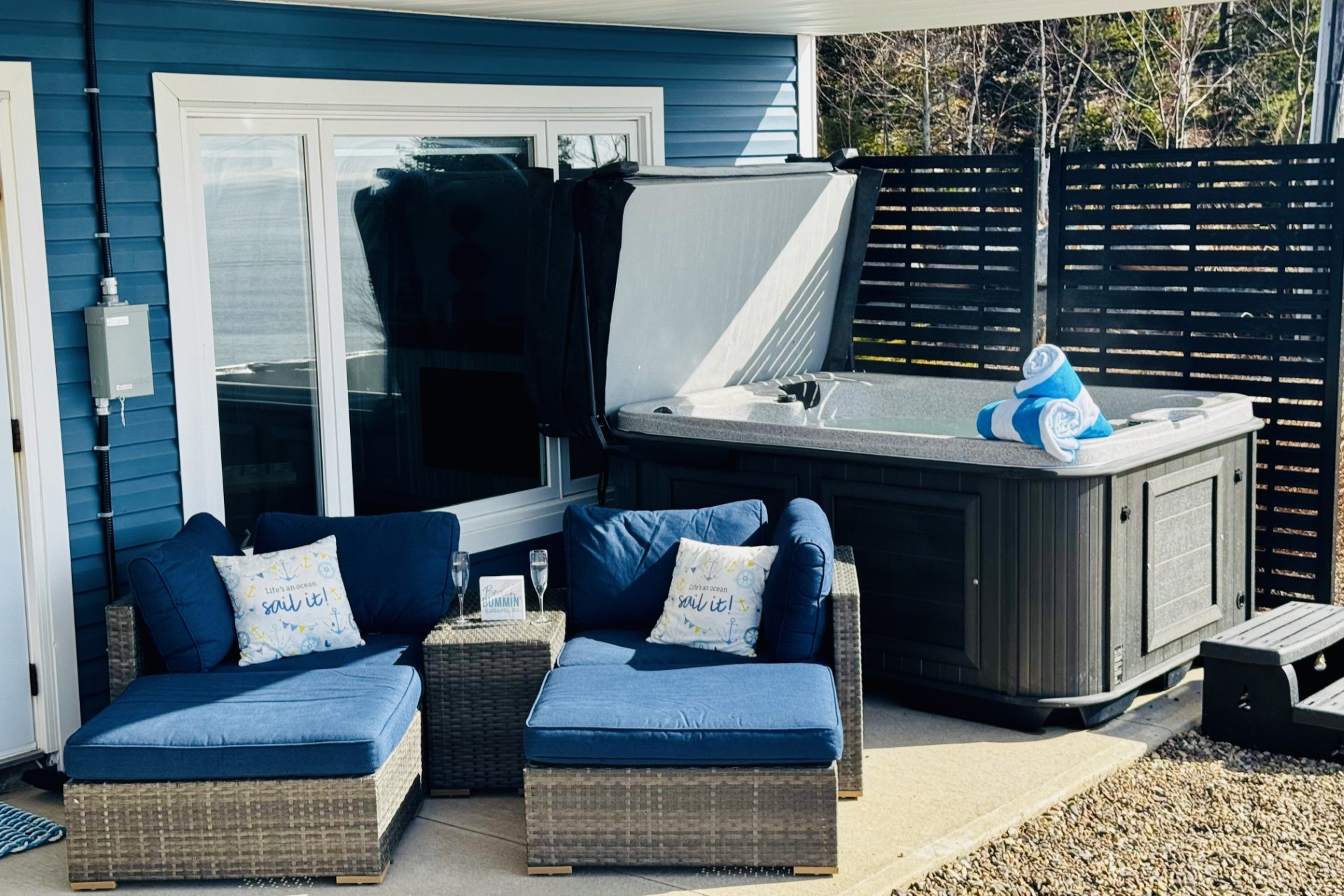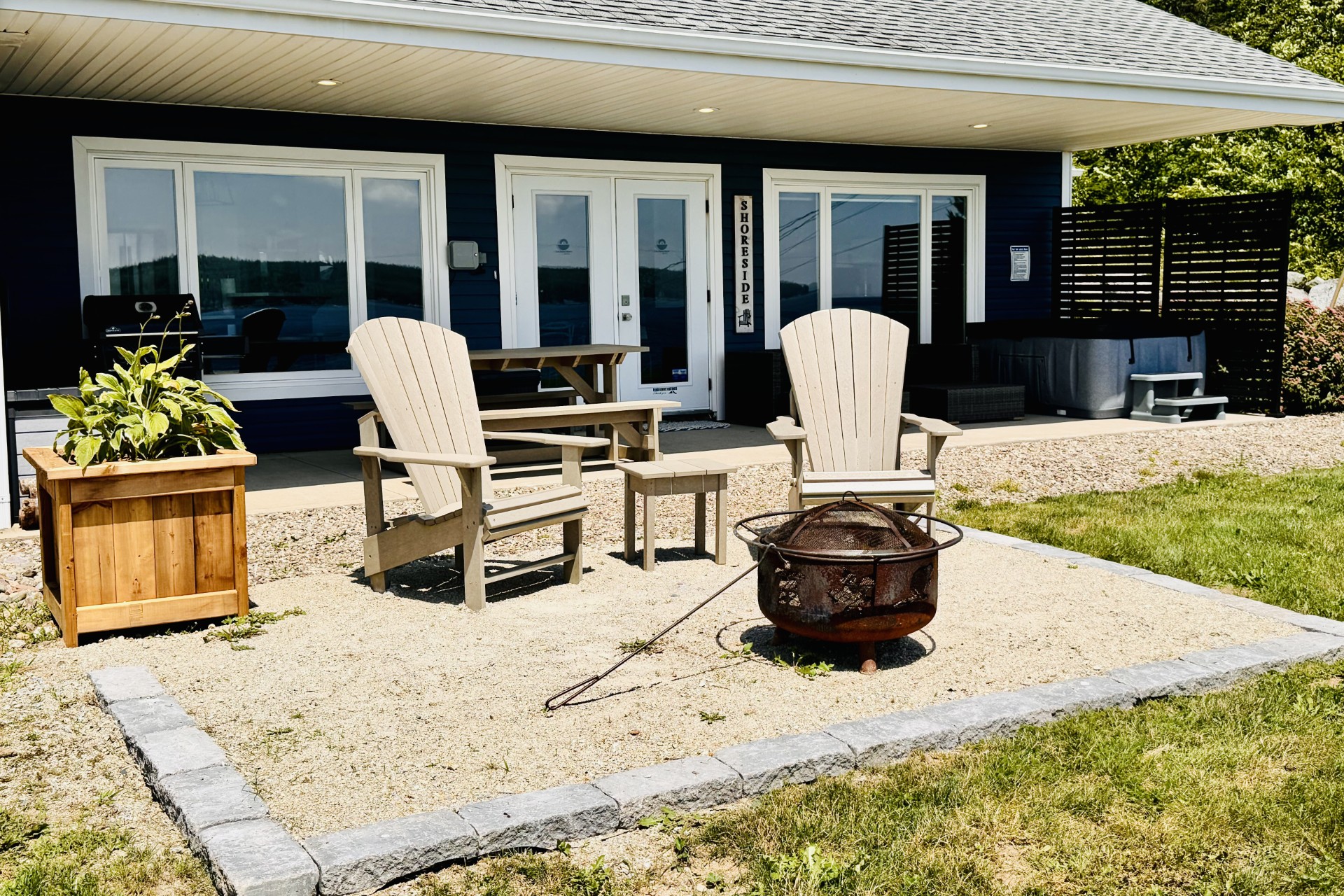 The Shoreside Unit is a lovely two-bedroom and one-bathroom unit that can accommodate up to 5 people with its living room sofa bed. It has a 55″ smart TV and a ping pong table. Enjoy the patio with a private hot tub, barbecue, and fire pit.