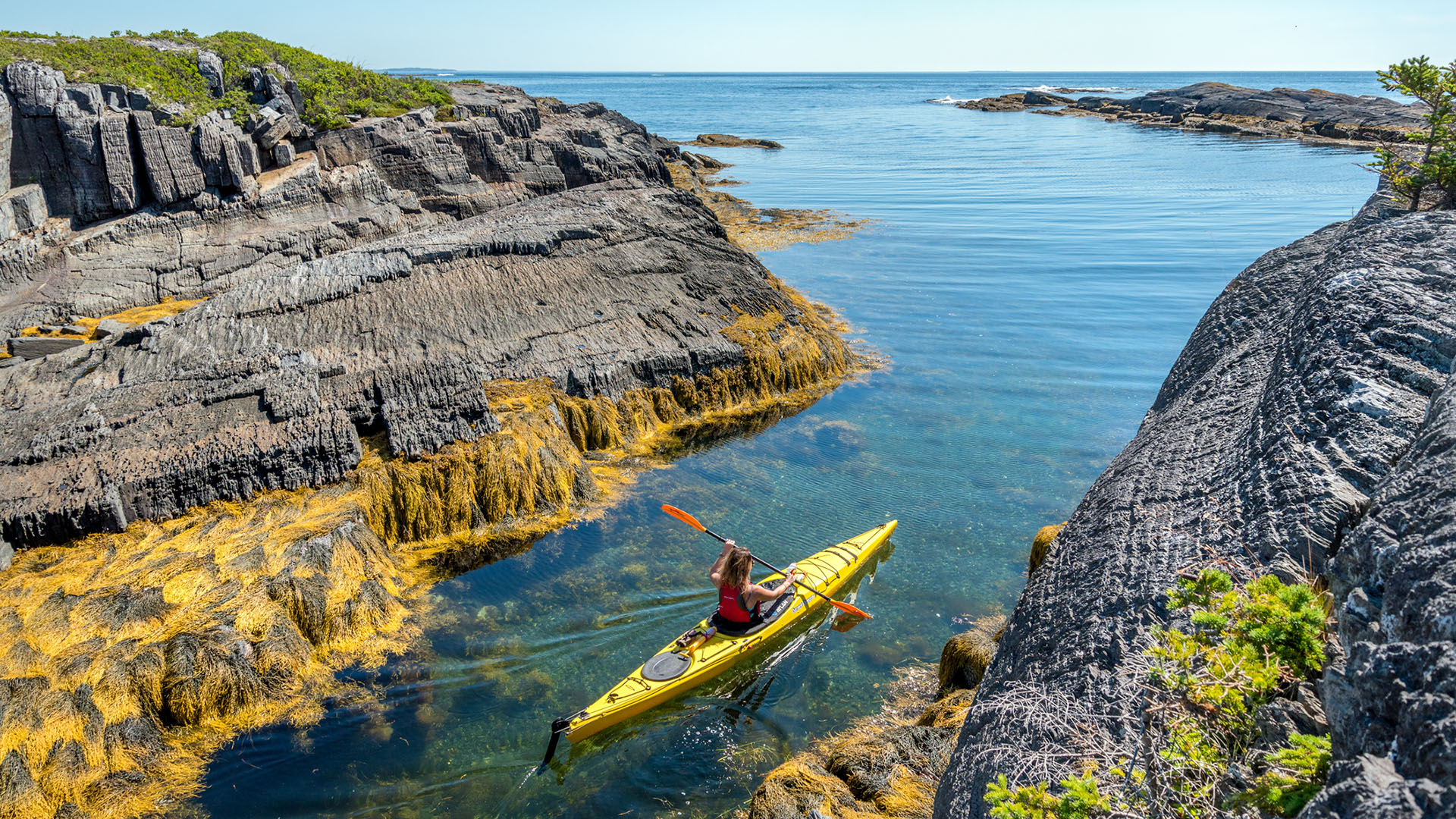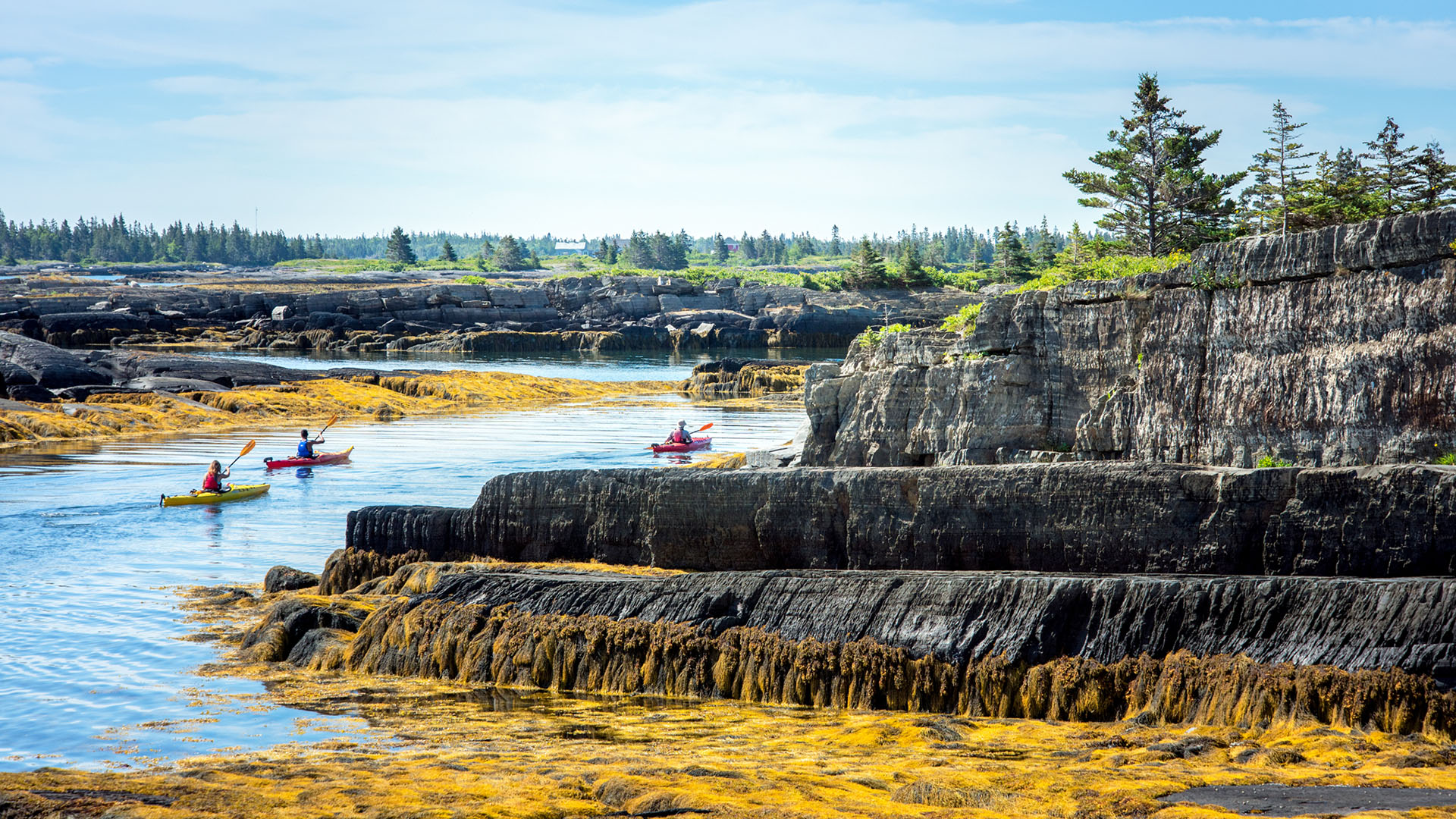 Islands, islands, and more islands! Paddle through the narrow passageways, lined with golden rockweed, of Blue Rocks’ sheltered, uninhabited islands. Explore hidden, sandy coves and rocky shoals, where many seals, seabirds and porpoises can be seen. Join one of our tours that showcase the best of this amazing area, from two hours to multi day trips.