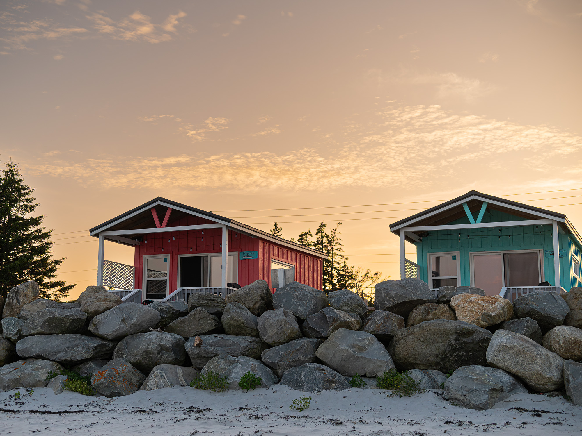 Our bunkies include a queen bed, dining table for two and covered porch with patio chairs and BBQ. The Bunkies have a shared full washroom facility a 30 second stroll away. Offering the perfect getaway for solo travellers, couples and friends, you can even book them both for your cozy oceanside stay.