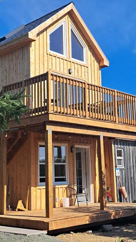The Tower is the newest accommodation rental on the property and is a 240 sq ft, two-story loft apartment with its own bathroom, custom pantry and kitchen space. Located above the Comfort Station that serves the Zzzz Moose Camping Cabins, guests staying in the Birch Plain Tower have a separate entrance that leads to a spacious deck overlooking the property and the Atlantic Ocean. The loft has a double bed along with two skylights above it, making it the perfect spot for stargazing!