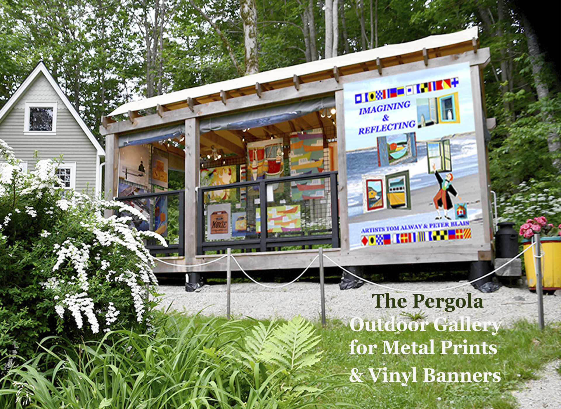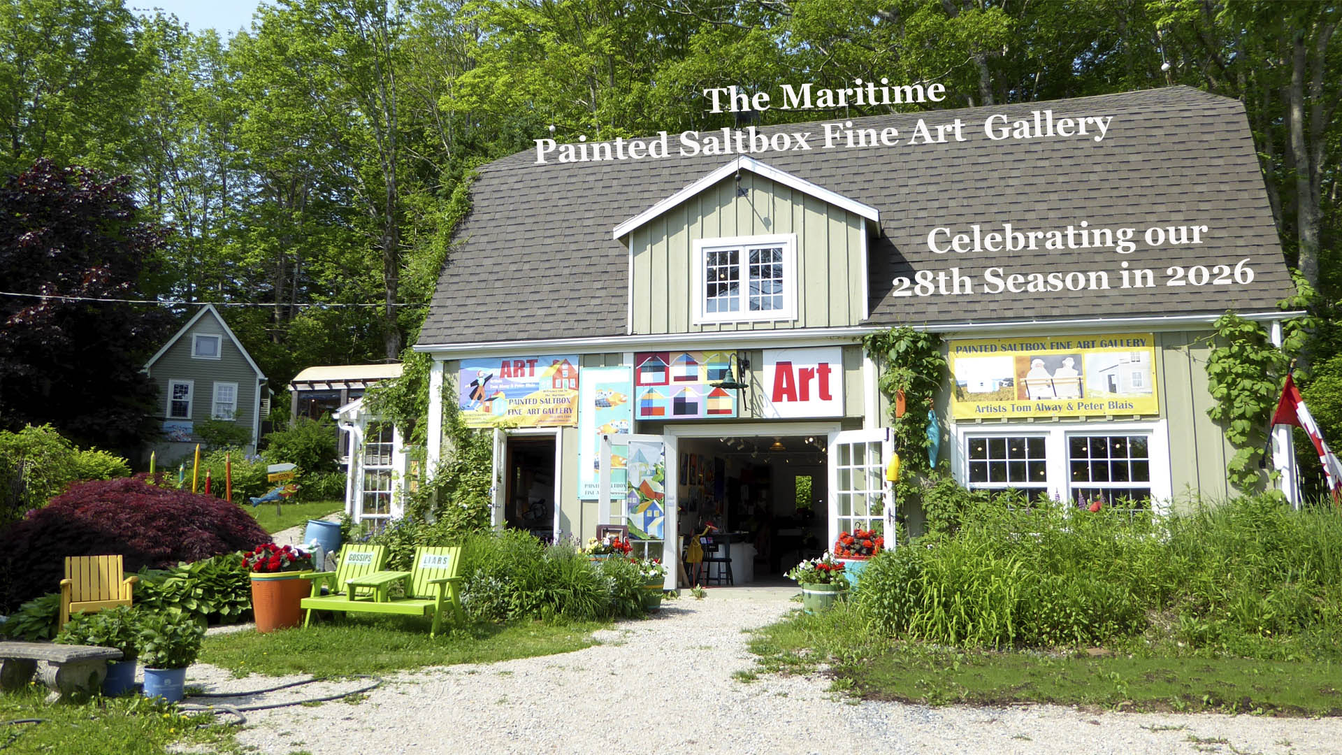Celebrating our 28th Season in 2026. The Maritime Painted Saltbox is a unique studio/gallery located in Petite Riviere, Nova Scotia, featuring contemporary fine, fun, and folk art, reproduction prints on metal, canvas, archival paper and vinyl banners by artists Tom Alway and Peter Blais. The work is housed in four rooms on two floors in a barn setting, in an outdoor building called the Coop, and in our new outdoor gallery, a covered 10′ x 20′ timber framed pergola.