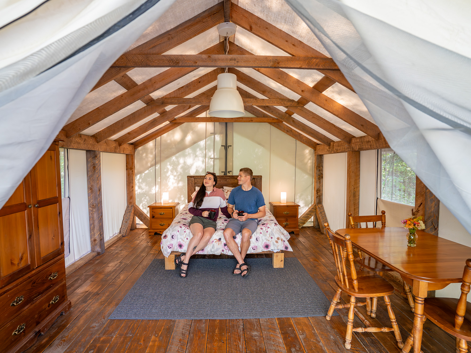 Located 45 minutes from downtown Halifax, each of our five luxurious glamping tents offers a unique experience. Our Apple & Cherry tents boast stunning views of hillside sunsets, while our Pine, Birch, and Spruce tents are nestled near scenic hiking trails. Enjoy privacy and comfort in every option. Our Pine Tent, located at the beginning of the wooded trail system, comes with a queen bed and its own attached wheelchair accessible washroom.