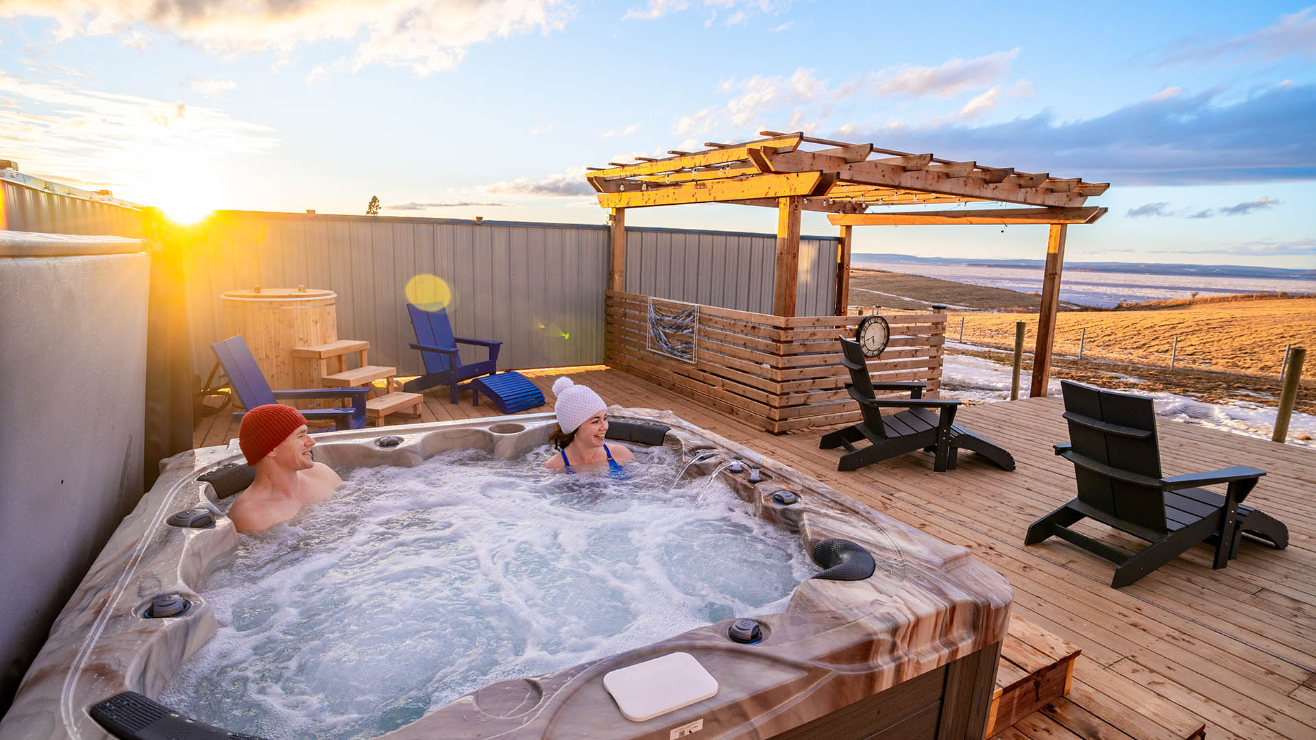 Indulge in the ultimate relaxation experience when you explore our shared access wellness area with a rejuvenating cold immersion tub, a soothing hot tub, a detoxifying sauna, and a cozy pergola with a fire table to warm your soul.