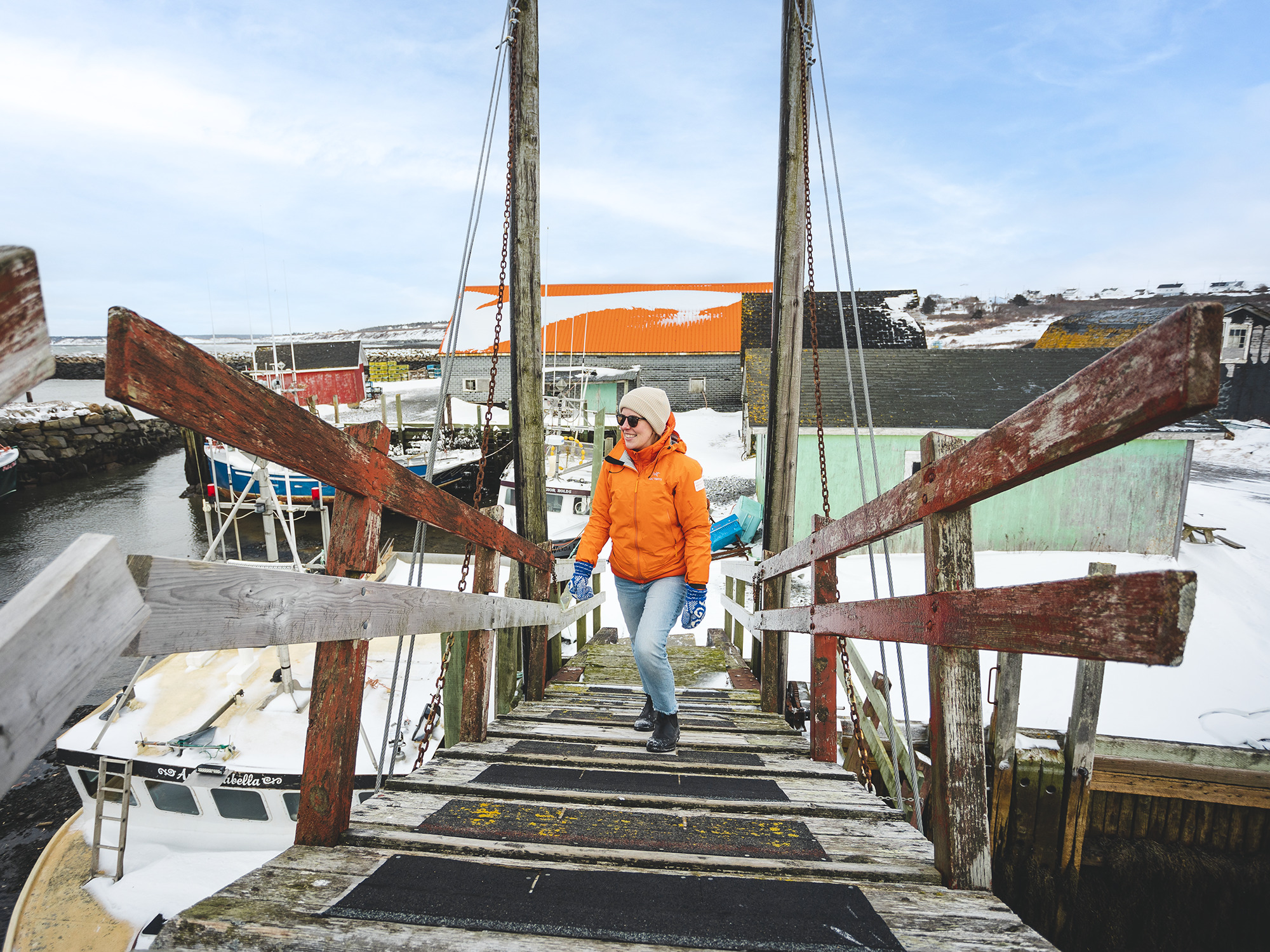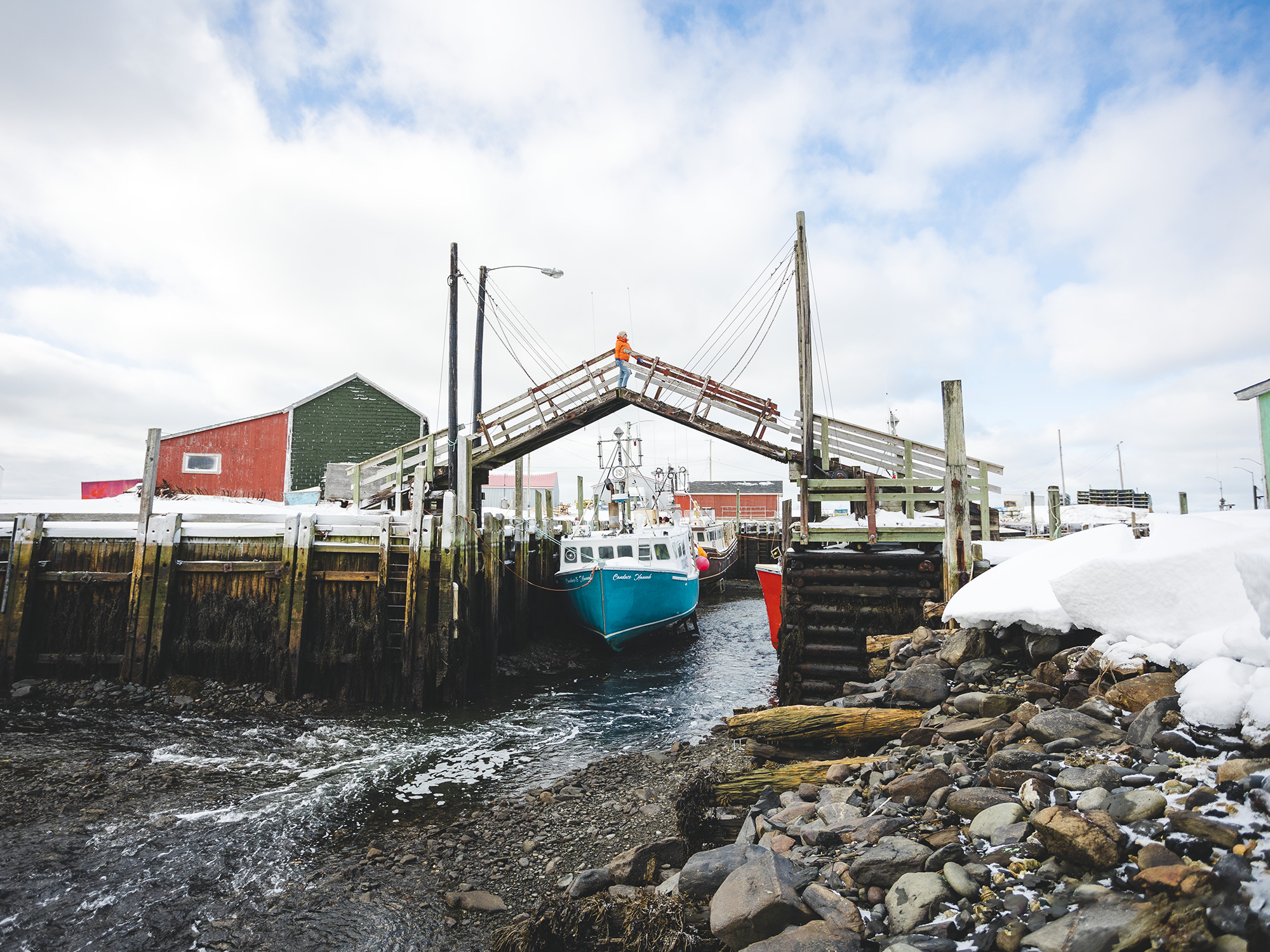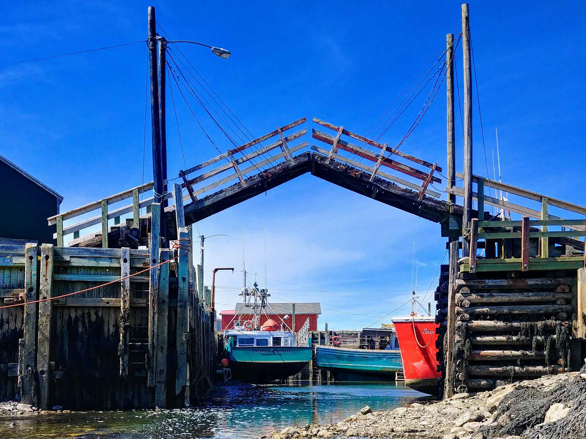 The wooden drawbridge, built in 1915 to allow boats to enter the inner harbour at high tide and to allow fisherman to cross from one side of the wharf to the other without having to drive back and forth around the harbour on the nearby road. Low tide in the Bay of Fundy will display fishing boats sitting on the harbour floor in the wharf.