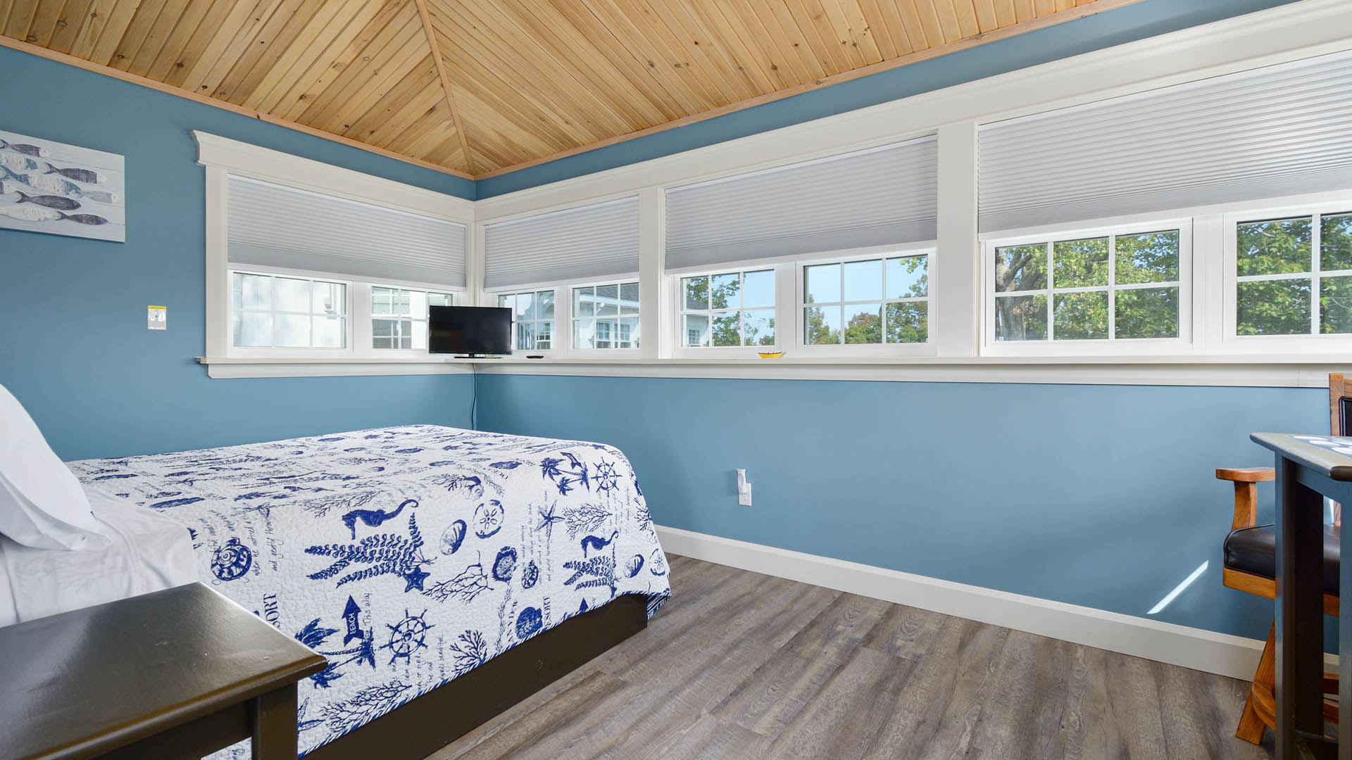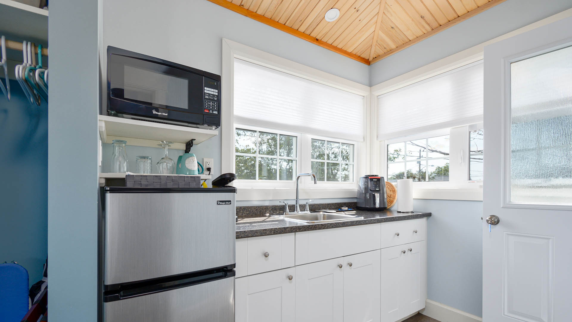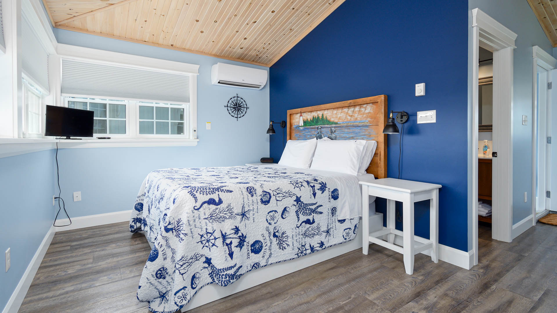 The ground level has a large kitchenette, queen-sized sofa bed, “McCurdy’s Sea-Chest” for a coffee table, a large smart TV, dining table with four (4) chairs, and a half-bath.