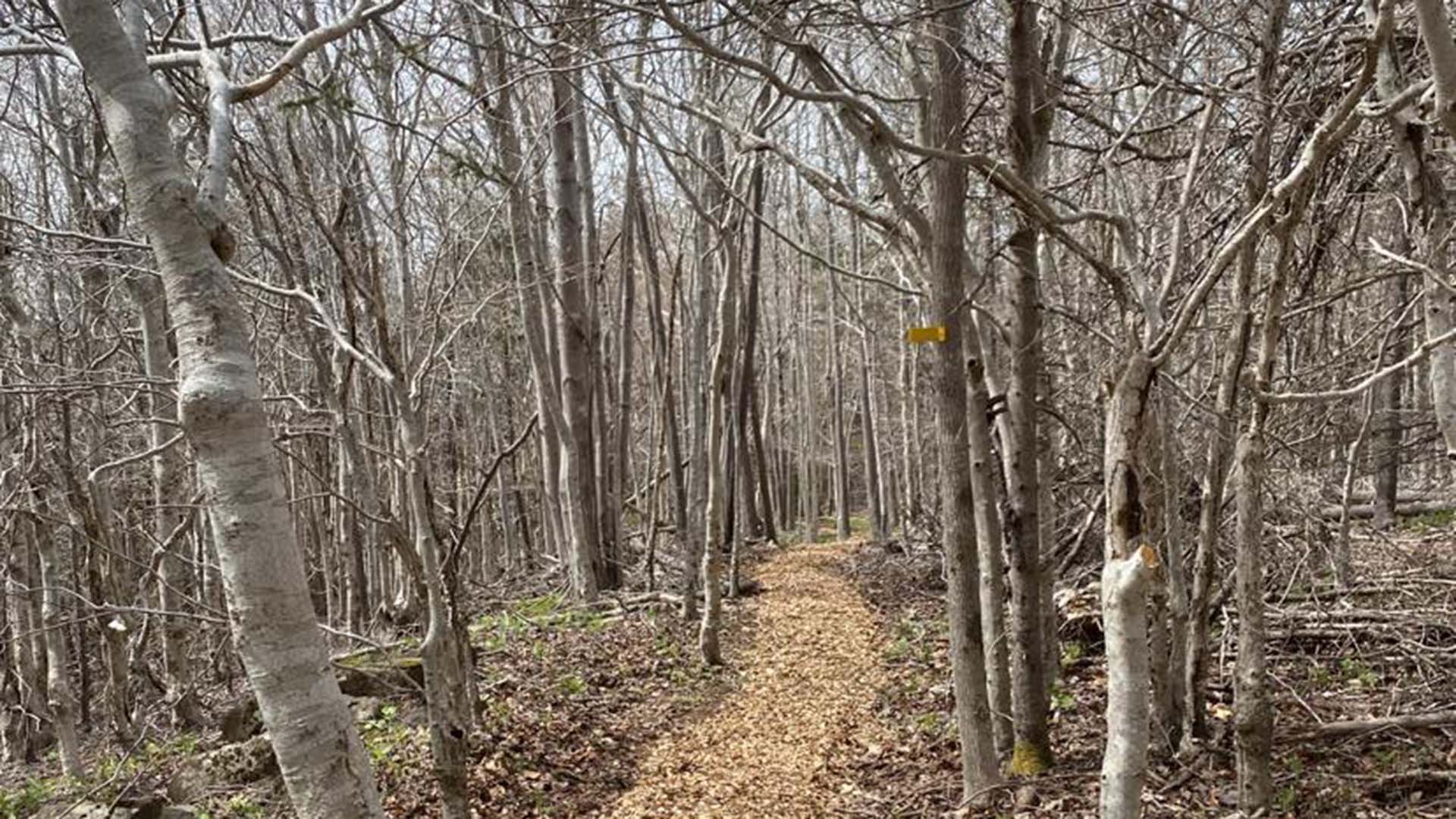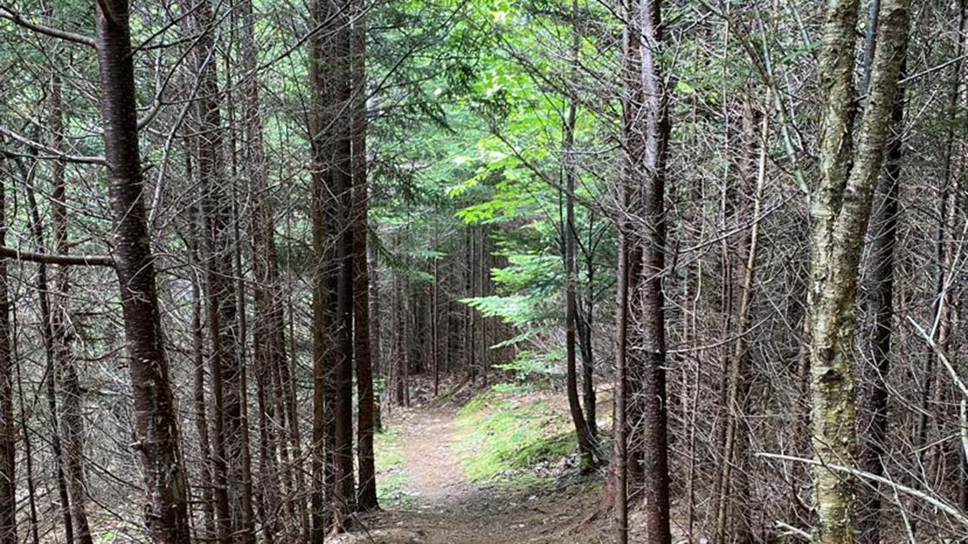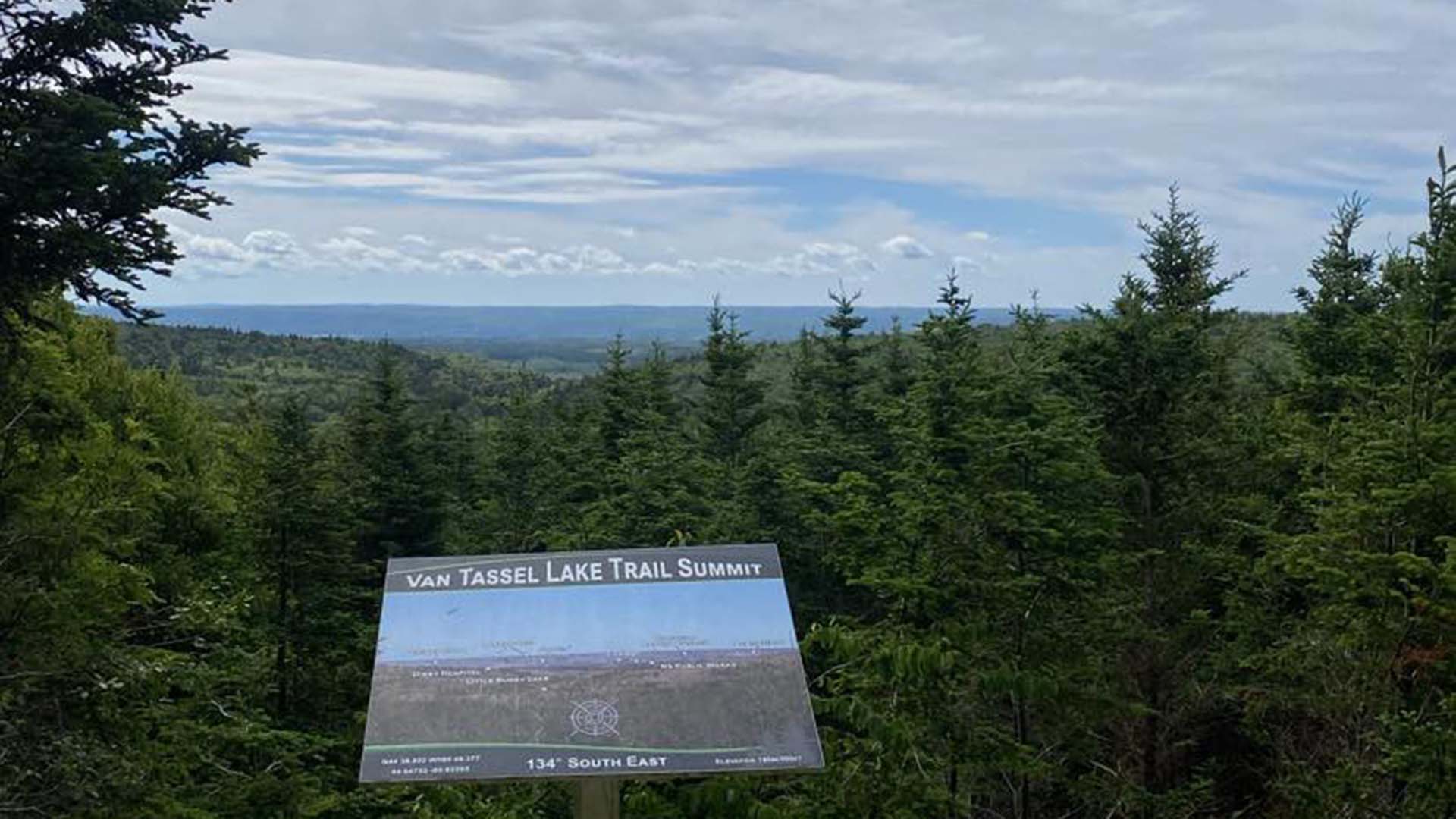 7 kilometres of single-track woodland trails five minutes from town. Trail loops around Van Tassel Lake, and one spur leads to a summit look-off. Picnic tables, benches, and great views.