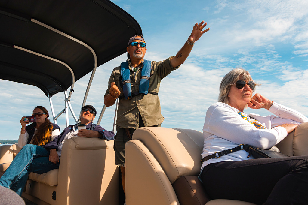 - Tour in comfort aboard a tritoon boat, with plush seats and overhead canopy